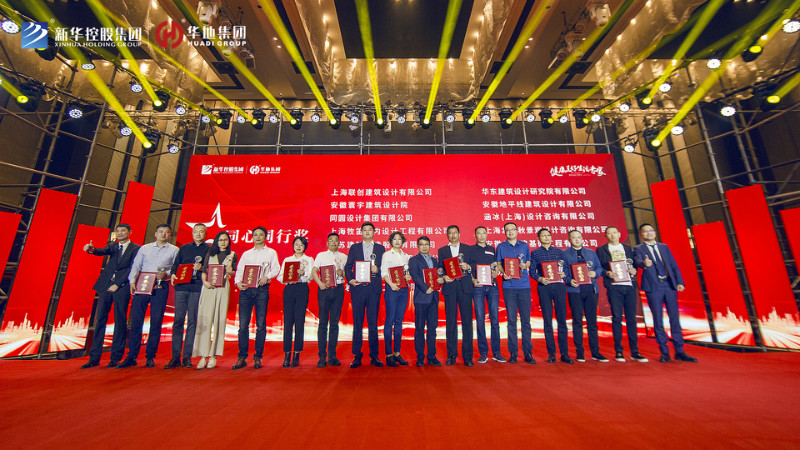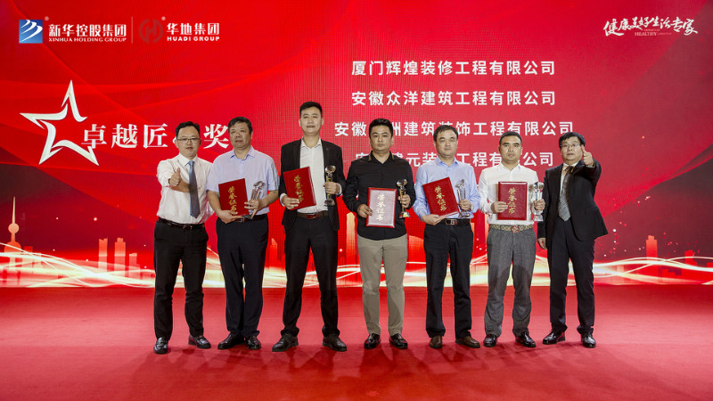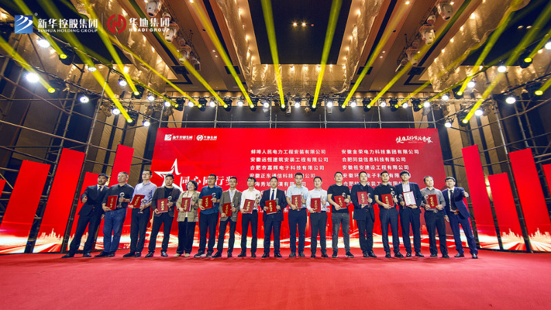 最后新華控股集團(tuán)副總裁兼華地集團(tuán)執(zhí)行總裁吳守狀先生、 新華控股集團(tuán)副總裁兼華地中安總經(jīng)理黃傳偉先生共同為標(biāo)力建設(shè)集團(tuán)有限公司、安徽省隆峰建設(shè)工程有限公司、浙江中成建工集團(tuán)有限公司、天元建設(shè)集團(tuán)有限公司、安徽省第一建筑工程有限公司頒發(fā)“年度卓越合作大獎”,將本次盛典氣氛推向高潮。