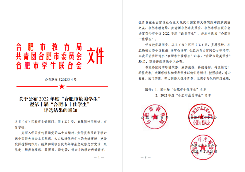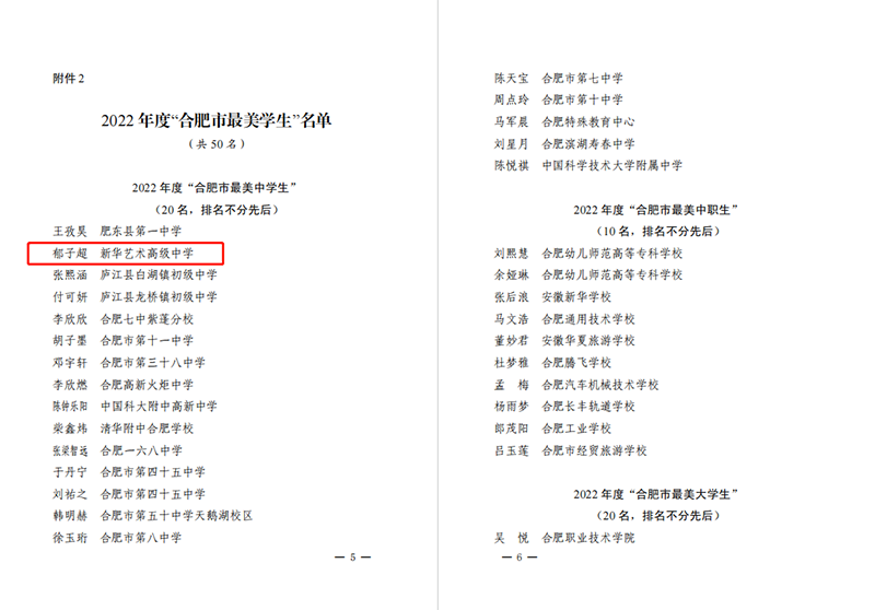 為深入學(xué)習(xí)宣傳貫徹黨的二十大精神,宣傳貫徹習(xí)近平新時代中國特色社會主義思想,大力弘揚優(yōu)秀學(xué)生的先進事跡,充分發(fā)揮榜樣的作用,近日,由合肥市教育局、共青團合肥市委員會、合肥市學(xué)生聯(lián)合會聯(lián)合開展的2022 年度“合肥市最美學(xué)生” 暨第十屆“合肥市十佳學(xué)生” 評選結(jié)果出爐。我校高二(1)班郁子超同學(xué)獲評“合肥市最美中學(xué)生”稱號!