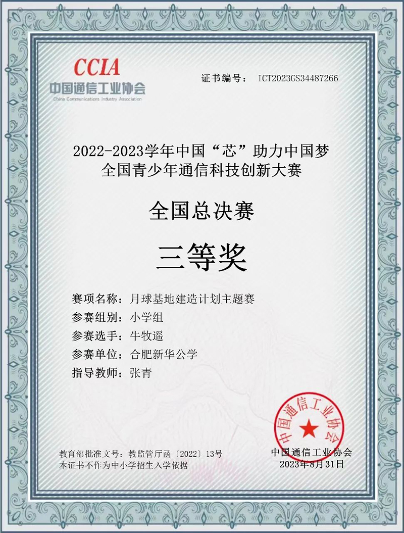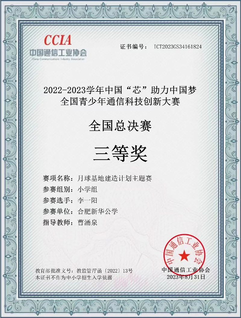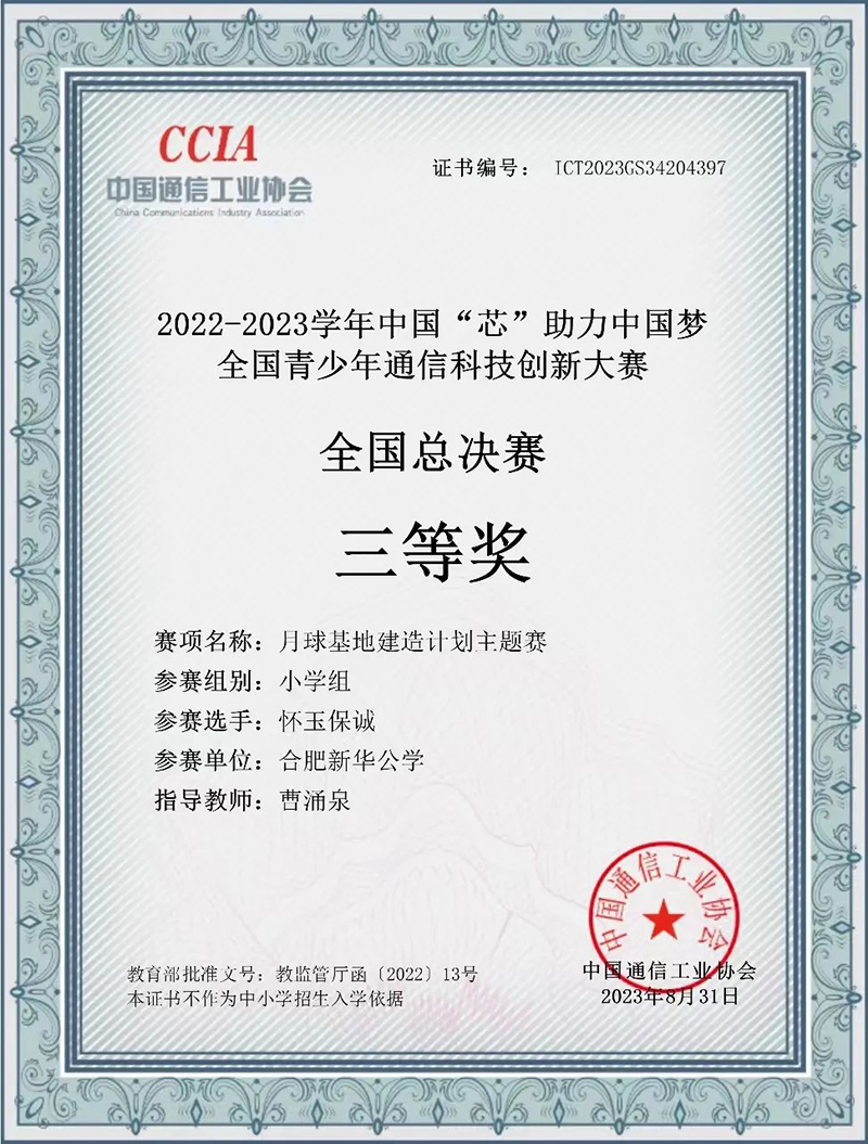 新華少年,未來可期!我校雙語部小學懷玉保誠、曾李宸、牛牧遙、李一陽四名同學,在“2022-2023學年中國‘芯’助力中國夢全國青少年通信科技創新大賽”中獲得全國三等獎!此次大賽共2000余人參與角逐,我校學子能夠在眾多高手中脫穎而出,實屬可喜可賀。