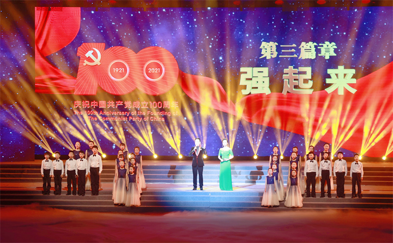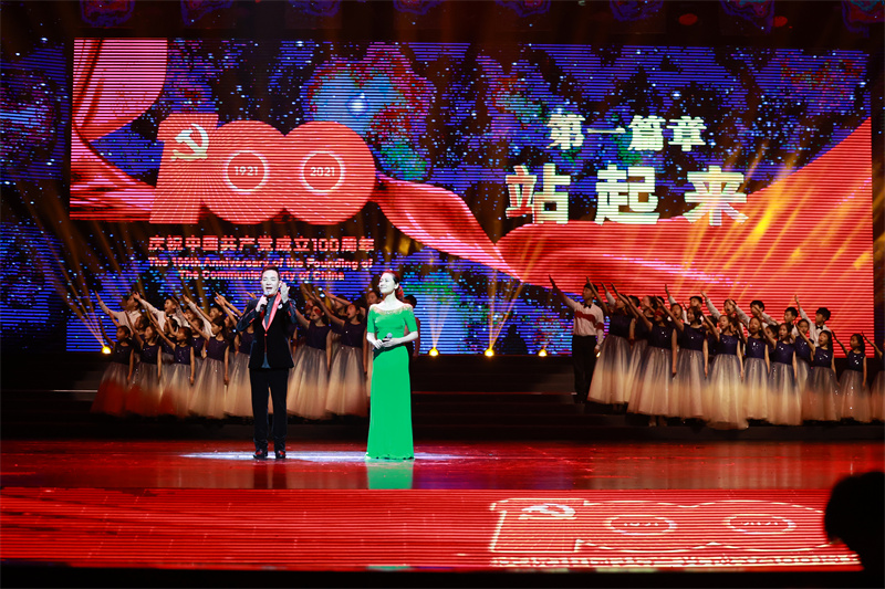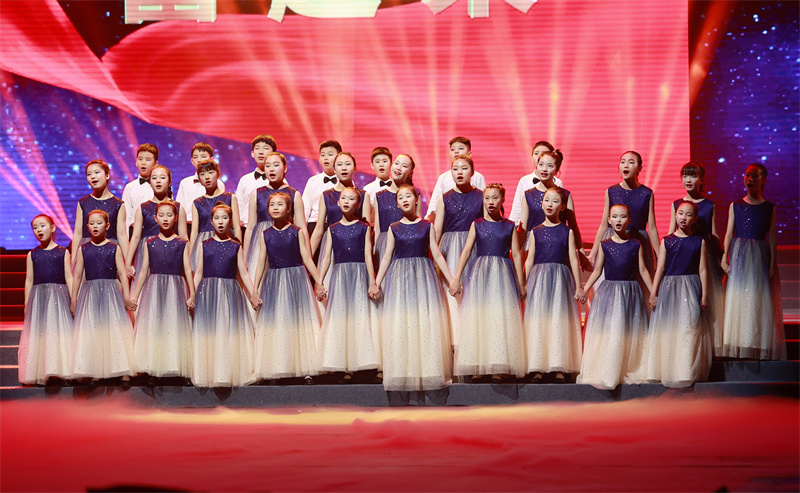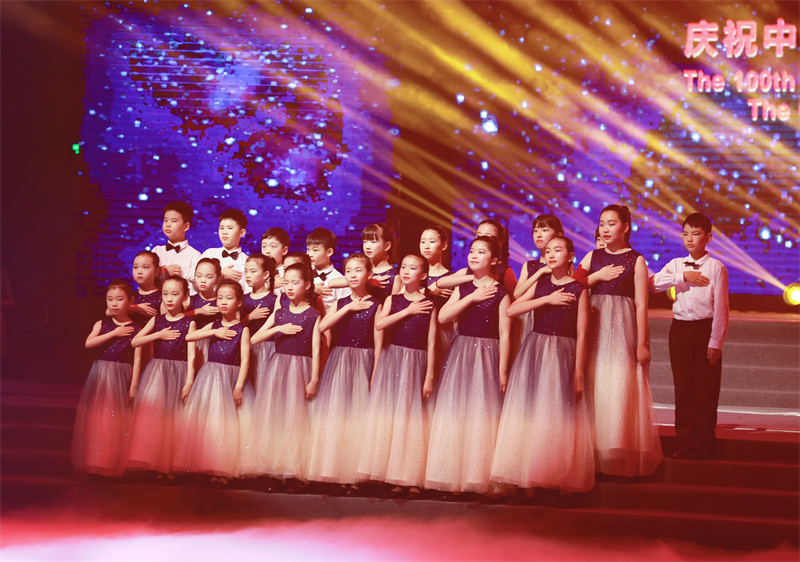 新華公學(xué)童聲合唱團(tuán)完美的用哼鳴式演唱法為晚會(huì)三個(gè)篇章開場,用歌聲向中國共產(chǎn)黨百年華誕獻(xiàn)禮,用微笑和行動(dòng)表明作為社會(huì)主義接班人的決心:“童心向黨,堅(jiān)決跟黨走,聽從黨的指揮”。