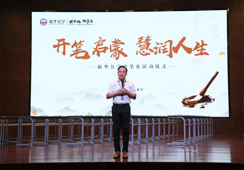 “開筆禮”是古代讀書人人生四大禮之一,被稱為人生“第一禮”,俗稱“破蒙”,對每個讀書人來說都有著重大的意義,是步入知識殿堂、走向成才的起點。9月28日下午,在新華公學(xué)報告廳舉行了莊嚴(yán)而隆重的“開筆禮”活動,一年級學(xué)生在家長與老師的見證下“開筆啟智”。新華公學(xué)總校長秦新春為此次開筆禮致辭,他期待同學(xué)們在中國傳統(tǒng)文化浸潤中,努力成為一名文明有禮、感恩孝順、積極進取的終身學(xué)習(xí)者。