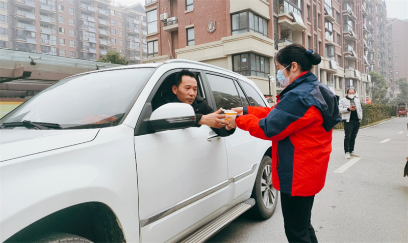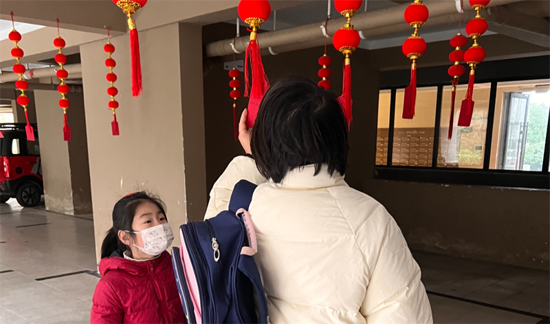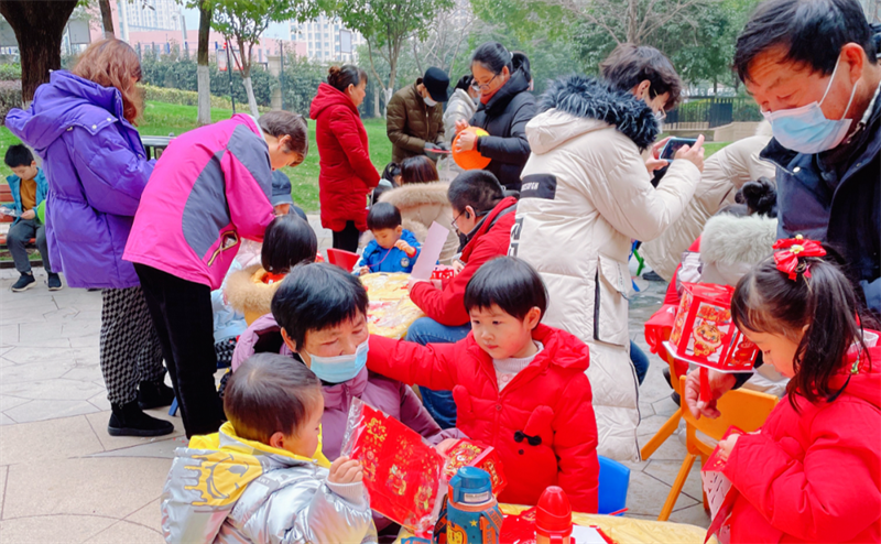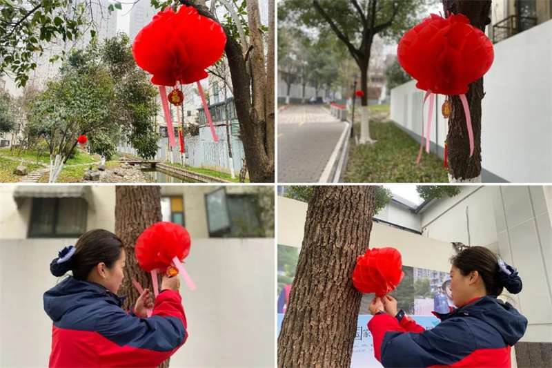 在徽商城市庭院,物業服務人員沿著園區主干道進行元宵燈謎的設計,來往的業主紛紛參與其中,沉浸在節日喜慶的氛圍里。