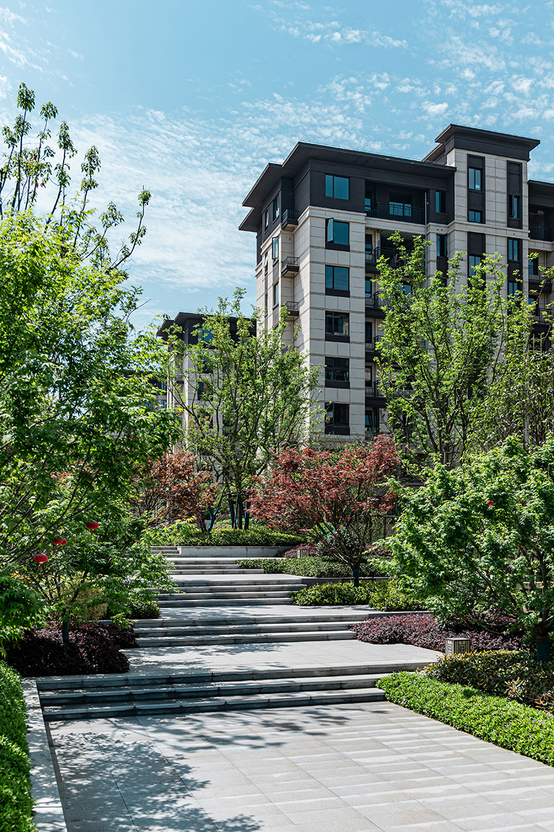 華地堅持以境造園,繪就詩意人生。景觀中軸由北至南,一脈貫穿,中軸線上匯聚多種珍貴樹種,呈四季斑斕,花香滿徑,樹影錯落,猶如一幅展開的畫卷,人于畫中游。