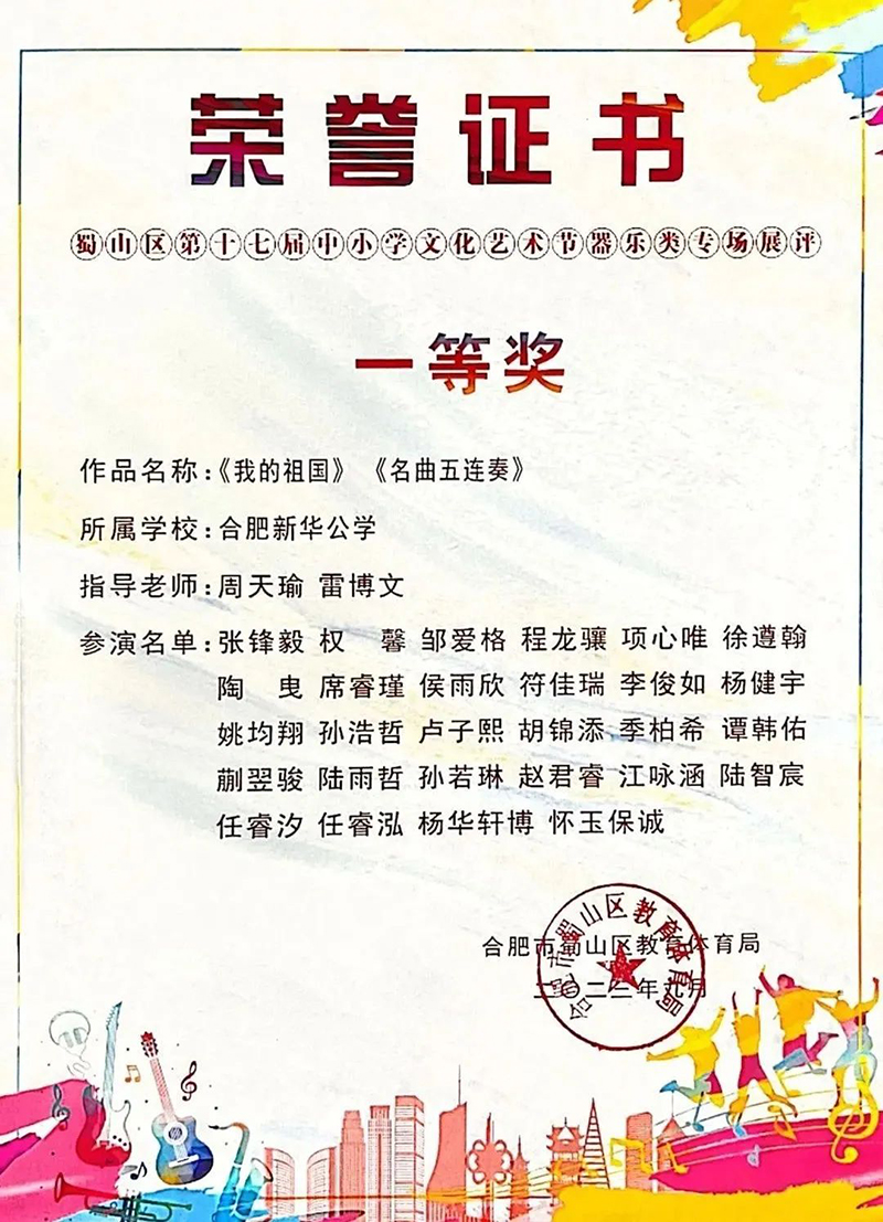 春華秋實,不負耕耘。在剛剛結束的合肥市蜀山區第十七屆中小學文化藝術節中,新華公學兩支參賽隊伍都表現出色,分別獲得了器樂合奏一等獎聲樂專場展評二等獎的好成績!其中,由28名學生代表組成的青少年交響樂團成功晉級市級比賽,并精心錄制了參賽視頻。